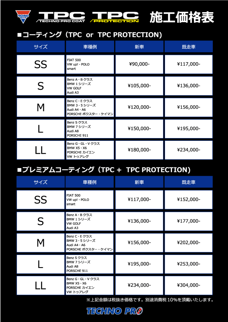 ・上記車種例に記載されていないお車の施工料金につきましては、当社までお気軽にお問い合わせください。